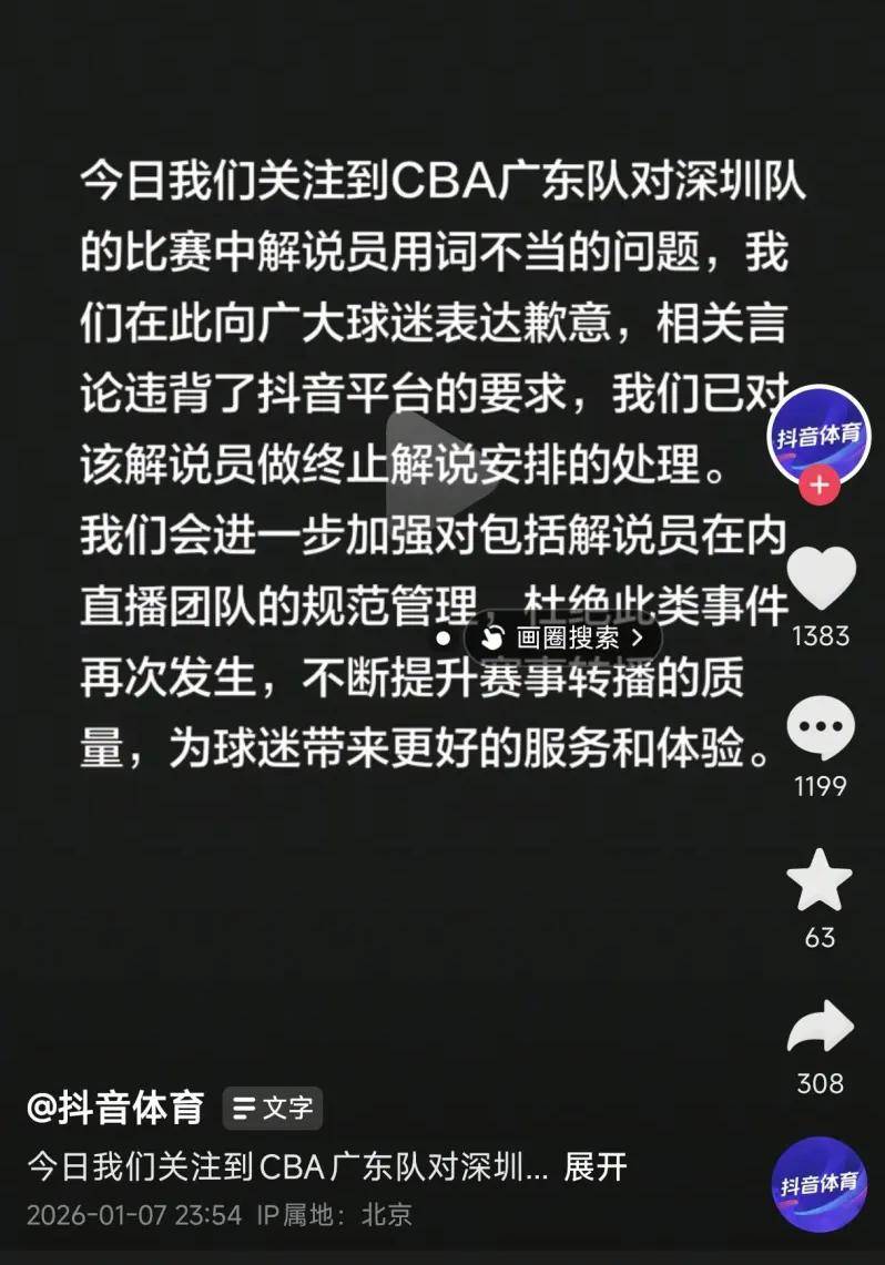 体育,足球,波胆,反波胆,角球,串关,大小球,世界杯,欧洲杯,比分,足球比分,赛事,足球赛事,电竞赛事,体育赛事直播,足球直播平台,世界杯直播,足球直播,体育直播,NBA直播,游戏直播,LOL直播1月7日,CBA广东110-105险胜深圳的德比战,因一段不当解说沦为舆论焦点。抖音体育官方深夜紧急致歉,宣布终止涉事解说员的解说安排,这则处罚公告迅速冲上热搜,引发全网对体育解说职业底线的热议。