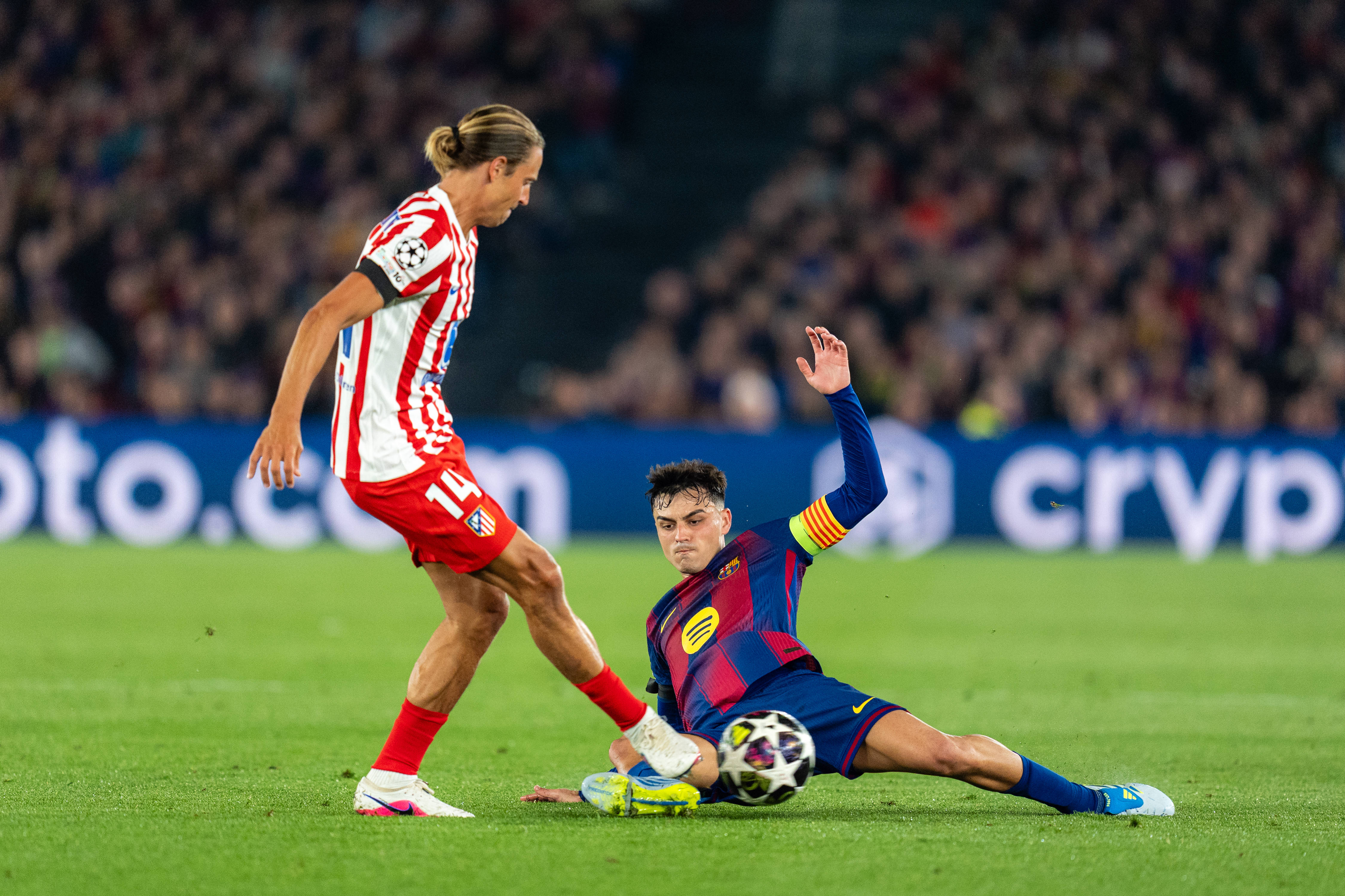 4月8日,巴塞罗那队球员佩德里(右)和马德里竞技队球员略伦特在比赛中拼抢。 新华社发(胡安·戈萨摄)