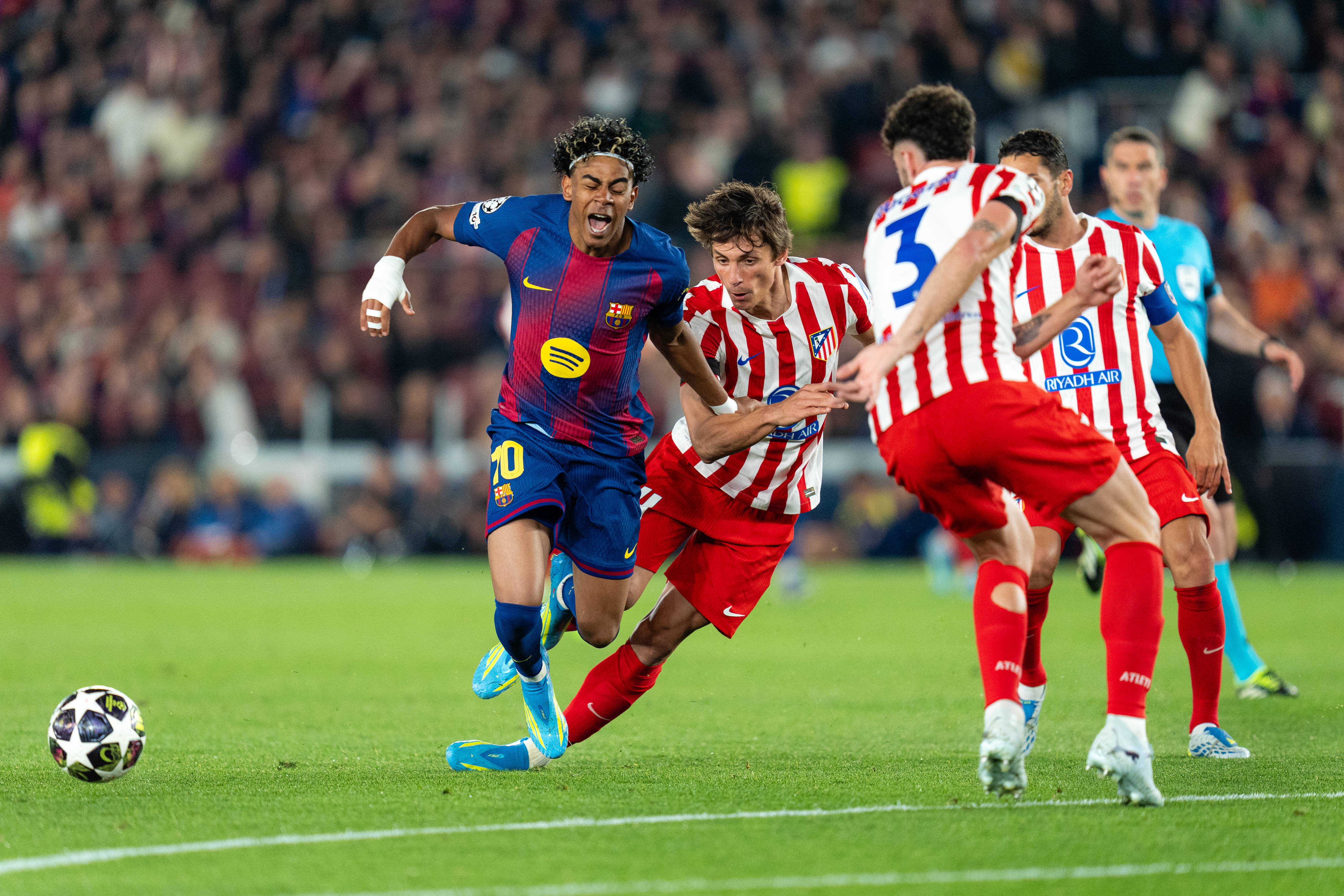 4月8日,巴塞罗那队球员亚马尔(左一)和马德里竞技队球员勒诺尔芒(左二)在比赛中拼抢。 新华社发(胡安·戈萨摄)