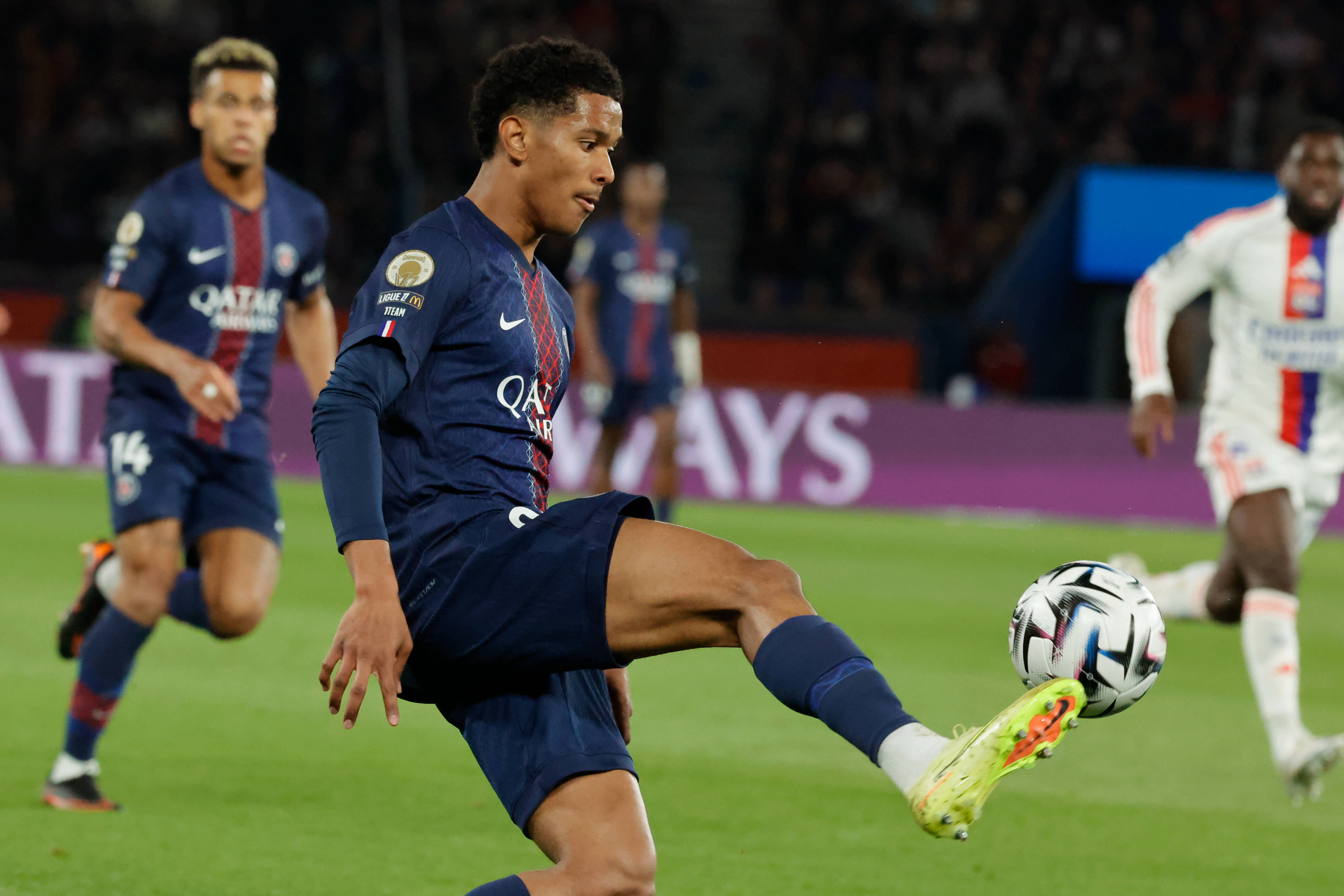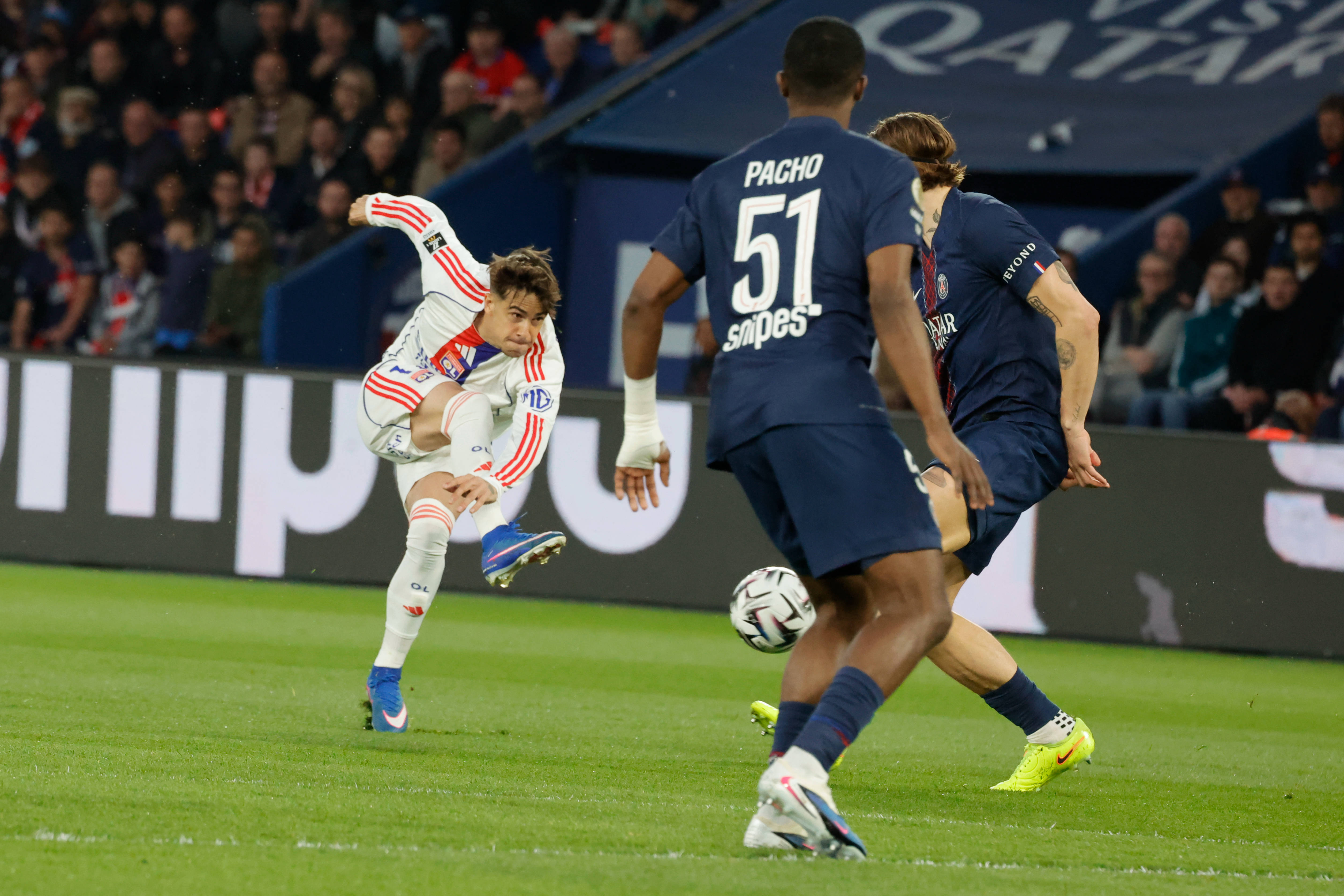 4月19日,巴黎圣日耳曼队球员阿什拉夫·哈基米(左)和里昂队球员恩德里克在比赛中拼抢。 新华社发(亨利·施瓦茨摄)