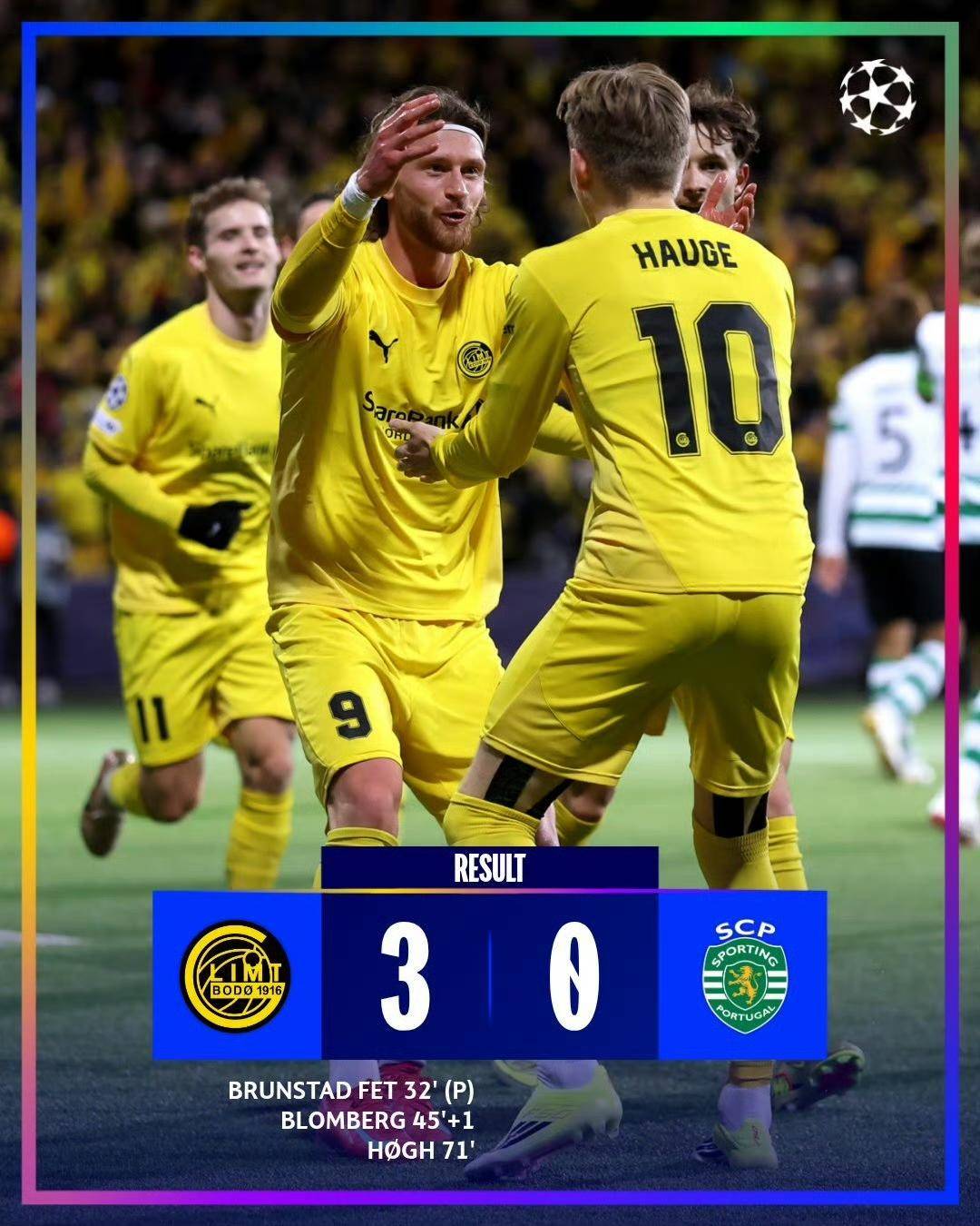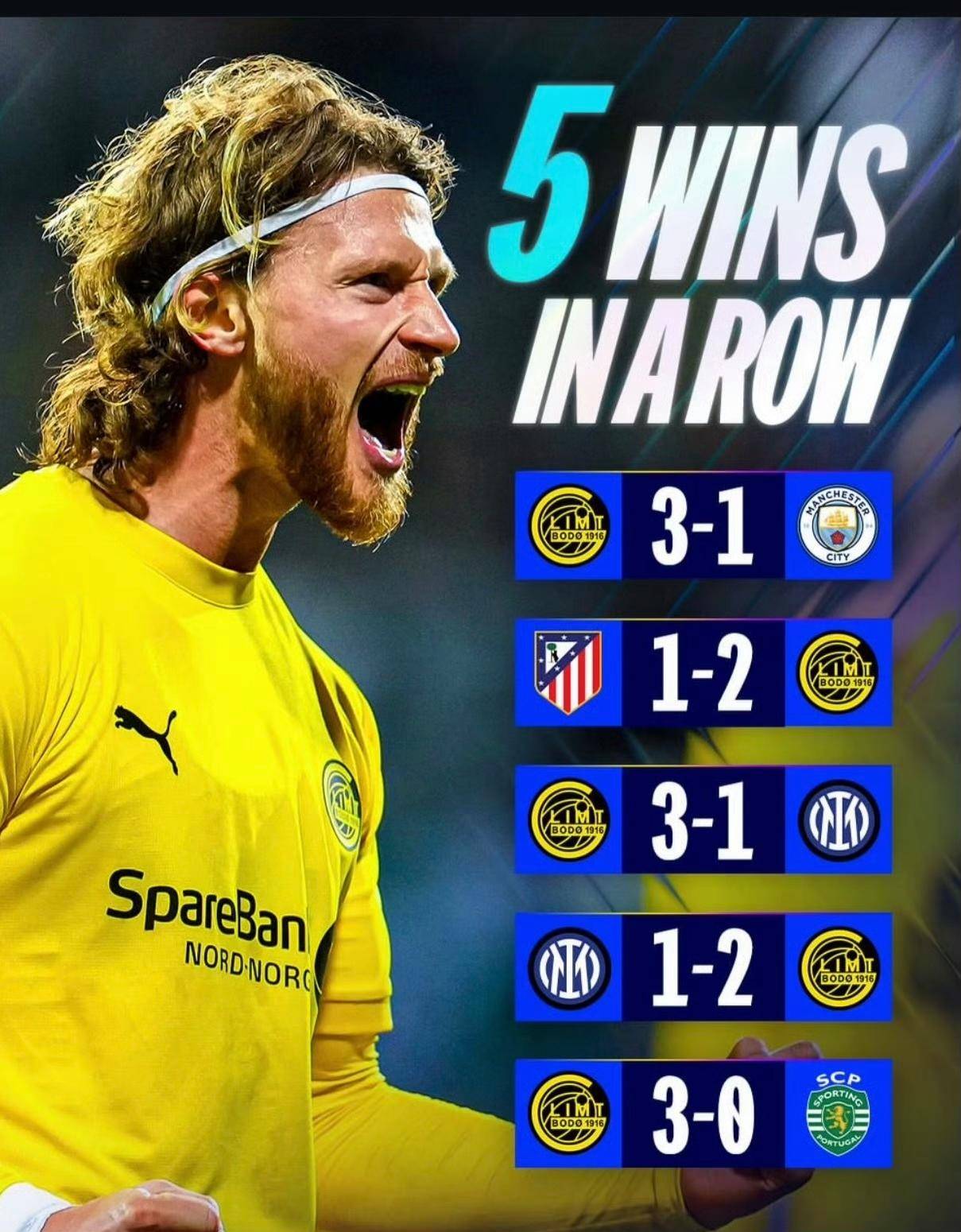 算上本场对阵葡萄牙体育的胜利,博德闪耀已经在欧冠赛场取得了五连胜,且在这五场比赛中,他们打进了12球,仅失3球。这样的表现,即便放在皇马、拜仁、利物浦身上也是值得大书特书的壮举,更何况是来自挪威、全队总身价仅5713万欧元的平民球队。
