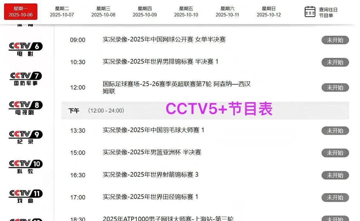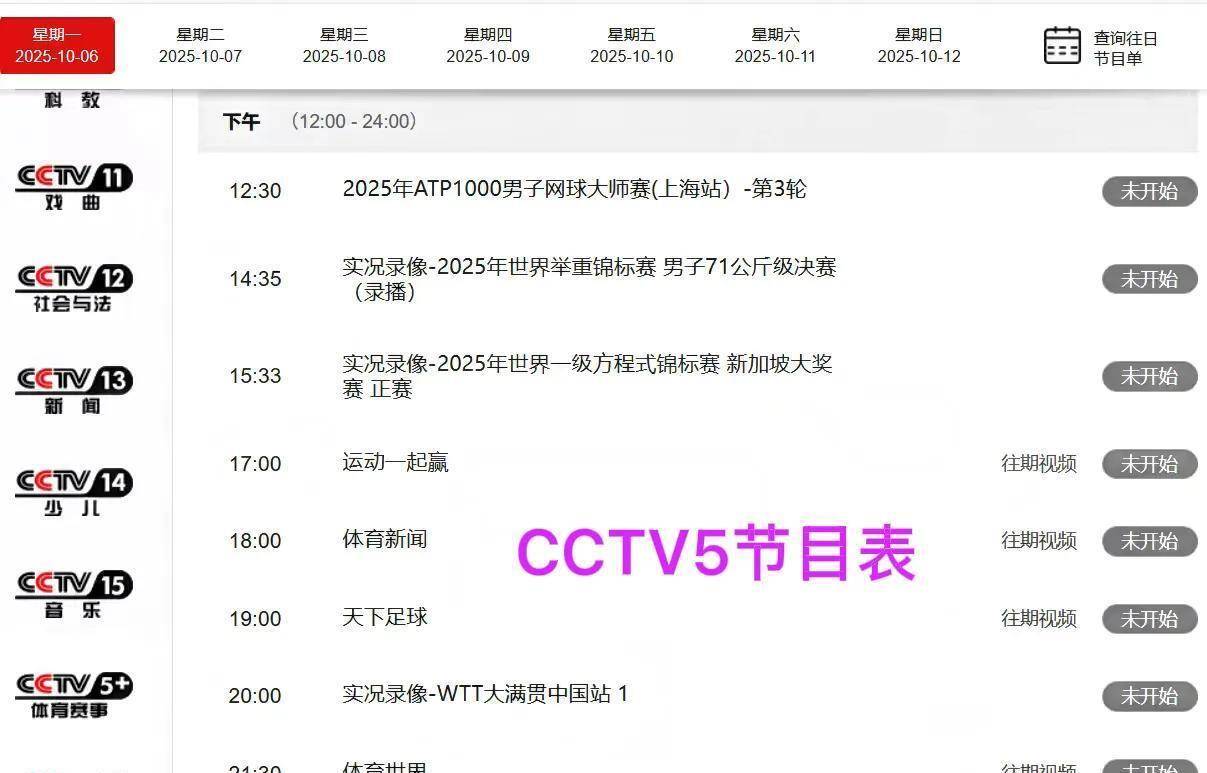 而就在这个体育狂欢的周末,央视的直播表早就排得满满当当。 今天10月6日晚上18点30分,CCTV5 频道准时切入ATP1000上海网球大师赛的第三轮较量。 中国小将商竣程能否在主场突破重围,成了今天最大的悬念。 同一时间点,CCTV5频道则用《天下足球》承包老球迷的晚间时光,不过硬核体育迷可能更惦记中午12点半CCTV5直播的网球赛,商竣程的出场顺序赶在了晚场前。
