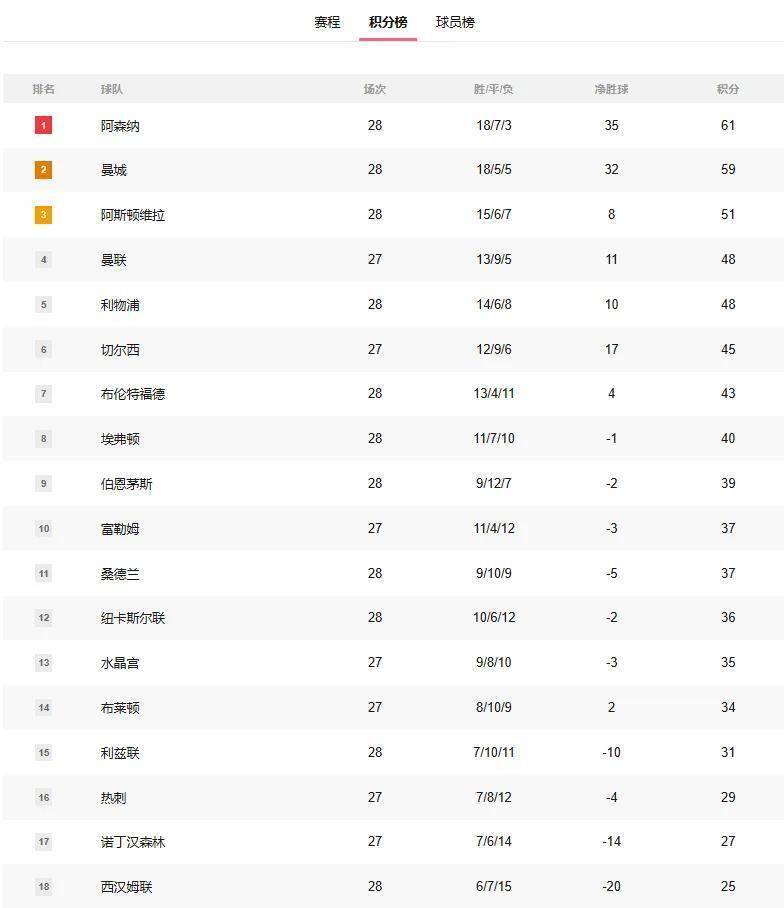 英超的积分榜,因为这个疯狂的夜晚,又有了新的微妙变动。阿森纳以61分领跑,但他们能感受到身后曼城59分带来的灼热呼吸。利物浦48分,与第四名曼联同分,因为净胜球劣势排在第五。阿斯顿维拉51分排在第三,但他们的状态也不稳定。从第七名到第十二名,分差只有7分,这意味着每一轮比赛的结果,都可能让积分榜中段发生剧烈的“地震”。布伦特福德、西汉姆联、切尔西、纽卡斯尔……这些球队都有各自的目标,或争欧战,或求保级,没有任何一场比赛是轻松的。