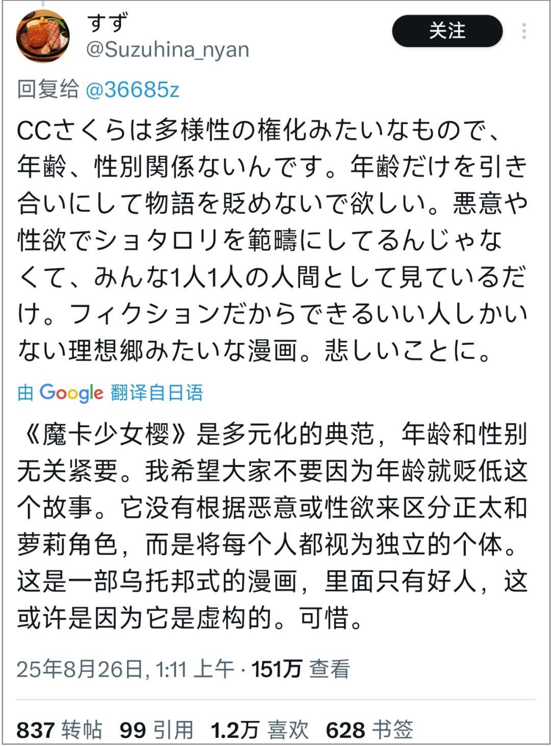 也有人反驳道,“《魔卡少女樱》是多元化的典范,年龄和性别在这个故事中无关紧要。它没有根据恶意和来区分正太或者萝莉,而是将每个人都视为独立的个体。这是一部只有好人的乌托邦漫画,但之所以如此,或许就是因为它是虚构的,可惜。”
