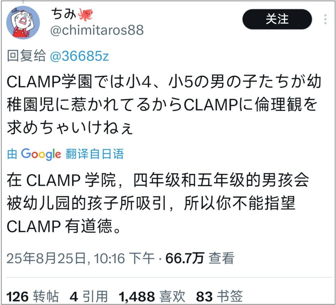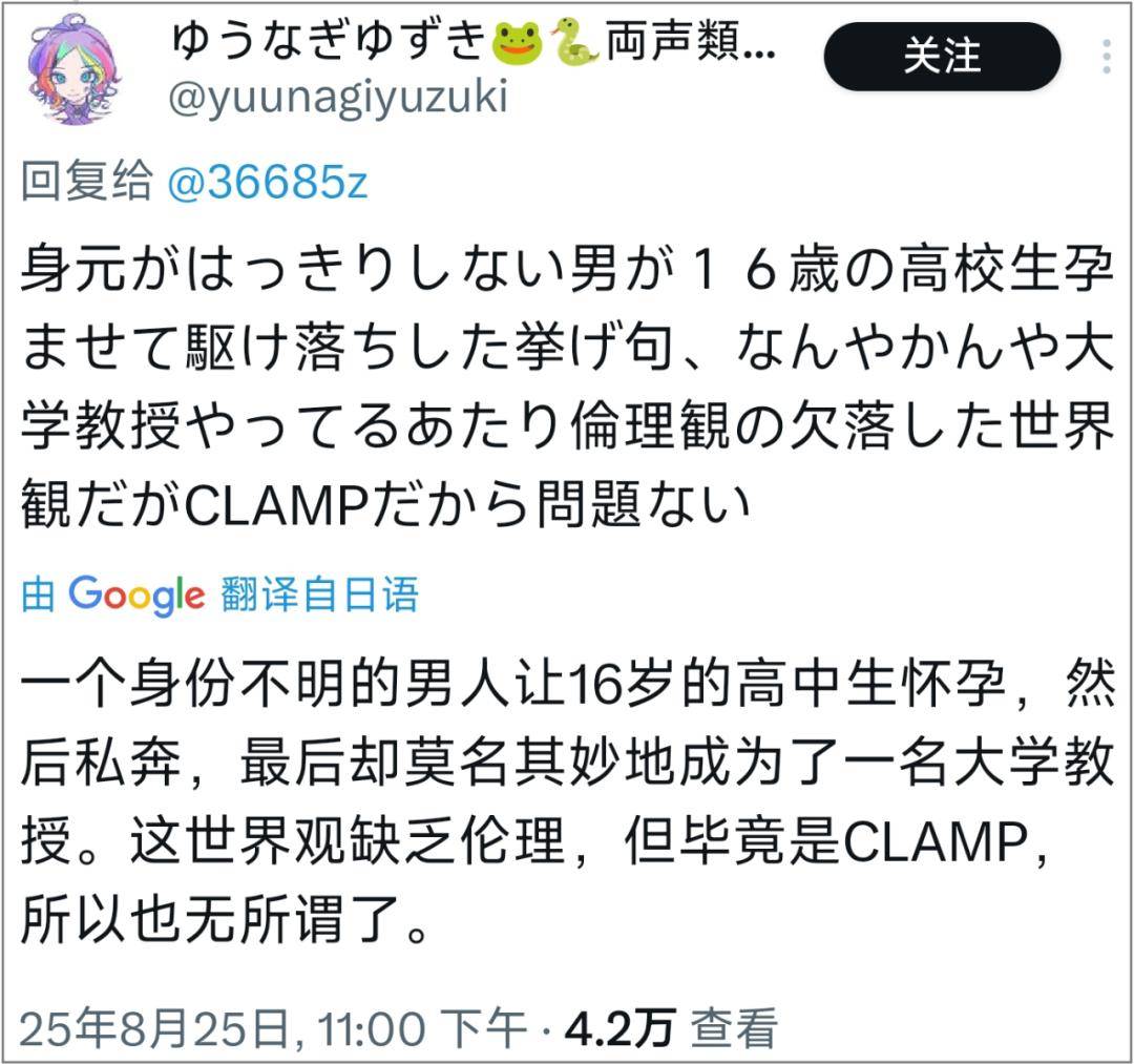 支持博主的观点认为,“一个身份不明的男人让16岁高中生怀孕,然后私奔,却莫名其妙成为了一名大学教授。这样的世界观缺乏伦理,所以你不能指望CLAMP有道德。”
