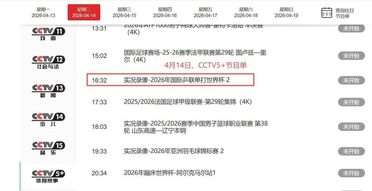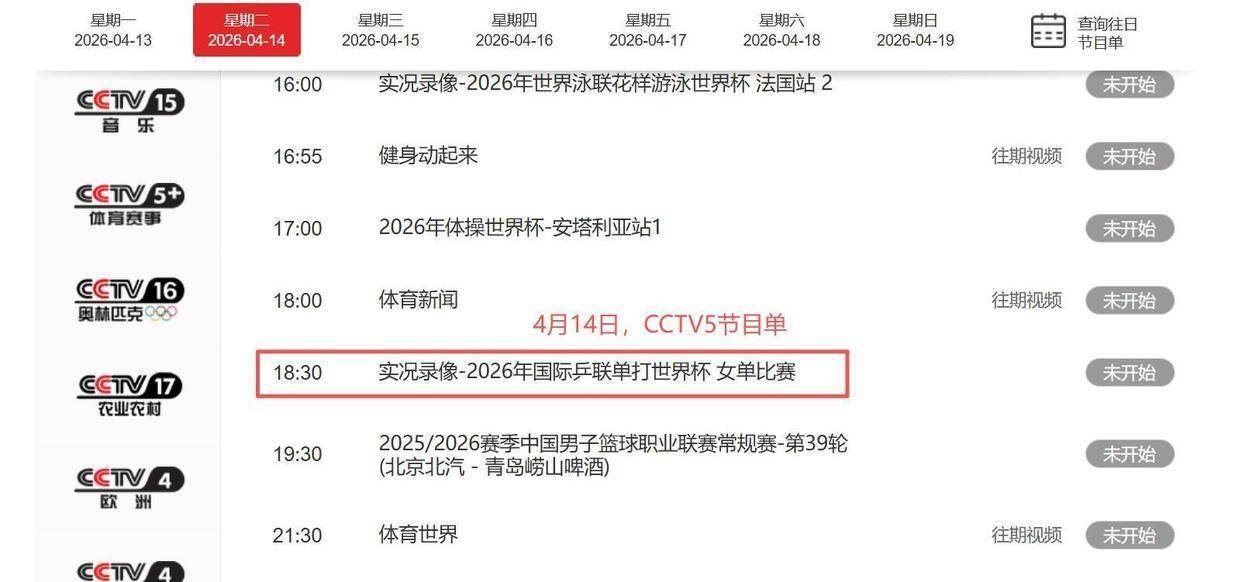 2026年4月14日,星期二,中央电视台体育频道,也就是大家常说的CCTV5,这一天的节目安排已经确定。 根据官方发布的节目单,在晚上18点整的《体育新闻》之后,18点30分将播出《实况录像-2026年国际乒联单打世界杯 女单比赛》。 这意味着观众可以在电视上回顾今年早些时候在澳门举行的世界杯赛事。世界杯是乒乓球三大赛之一,水平极高,国乒选手孙颖莎和王楚钦都在那届比赛中夺得了单打冠军。除了CCTV5,它的姊妹频道CCTV5+也在下午16点32分安排了《实况录像-2026年国际乒联单打世界杯 2》的播出。 对于无法收看直播或者想再次品味经典比赛的球迷来说,这无疑是个好消息。